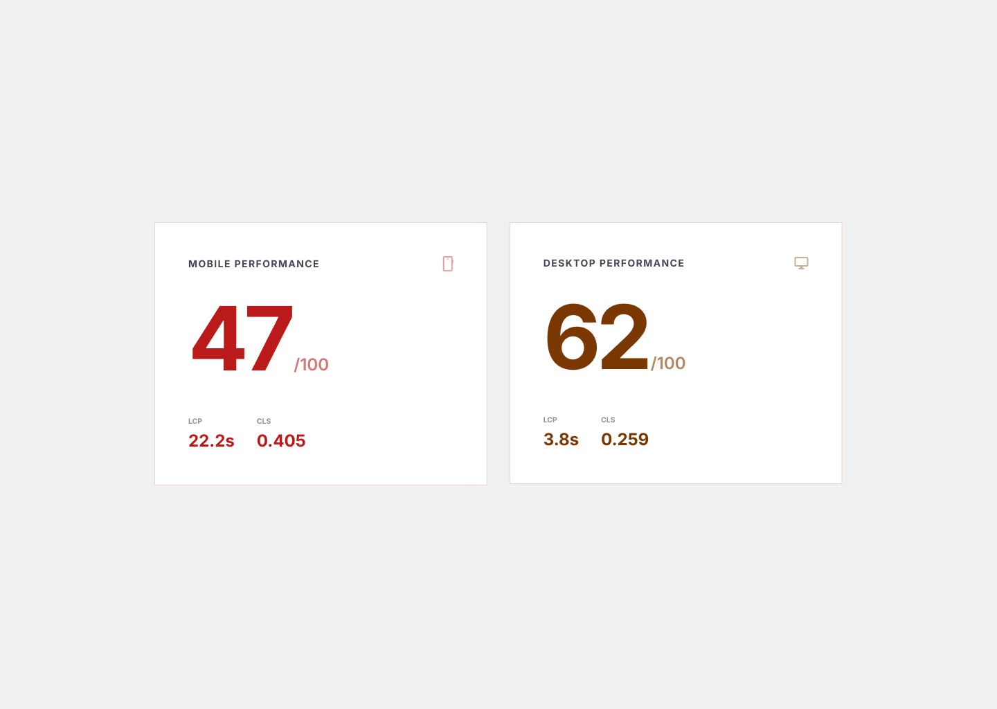 In the media platform audit, mobile performance scored 47/100 on PageSpeed Insights — significantly below Google's "Good" threshold. The LCP (Largest Contentful Paint) was 22.2 seconds on mobile, meaning users stared at a partially loaded screen for over 20 seconds before seeing real content. Cumulative Layout Shift (0.405) meant buttons and headlines jumped while the page loaded, causing mis-taps and reading position loss. GTmetrix gave the site a D grade (55% performance, 78% structure).