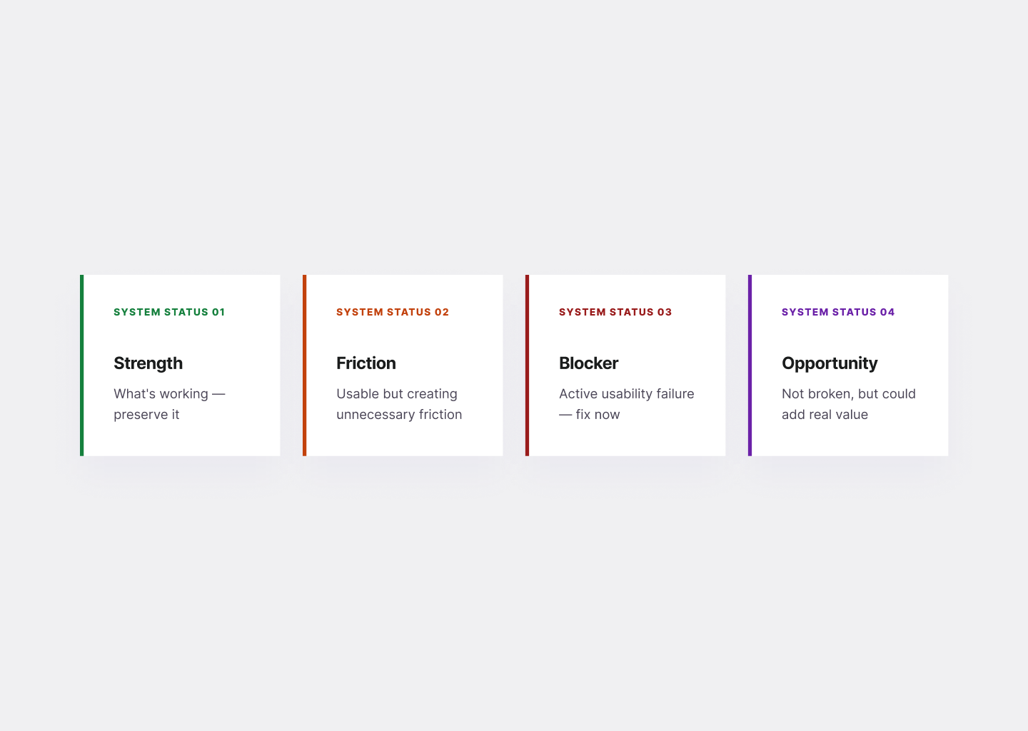 A UX audit is also not a redesign. It's not a recommendation to rebuild everything. A good audit tells you what's broken, what's sub-optimal, what's actually working, and in what order to address it. The output should enable confident decisions — not more debate about whether to change something.