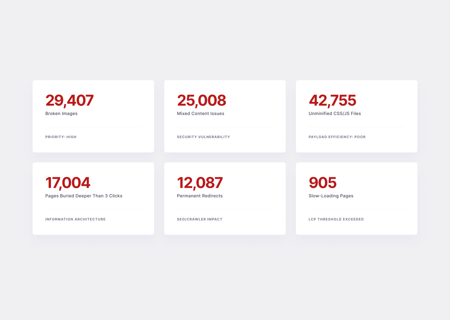 Root causes: 29,000+ broken images increasing rendering instability; 42,000+ unminified CSS and JS files increasing payload; inconsistent caching with no object caching configured; render-blocking CSS and JS delaying first paint; oversized media with no compression or lazy loading.