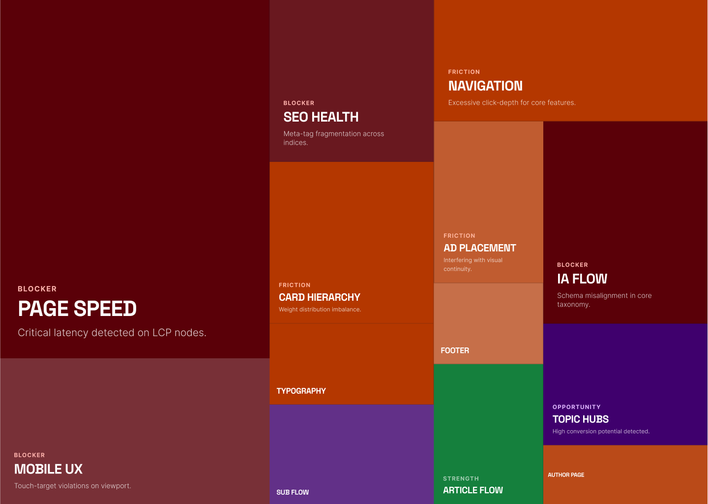 These aren't design problems. But they directly affect design outcomes — ad viewability, engagement depth, bounce rate, and Google's quality signals for organic ranking. A design team that doesn't surface these issues is delivering an incomplete audit.