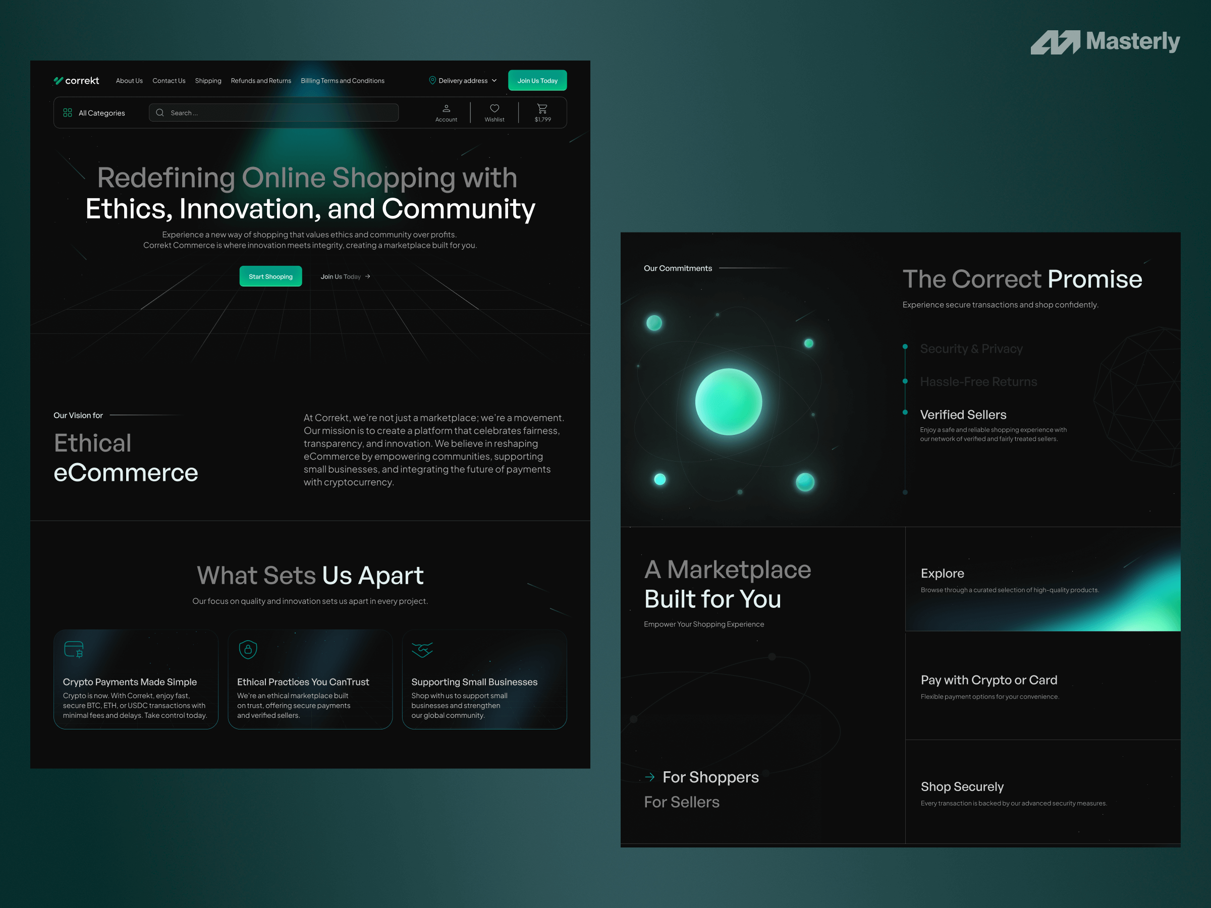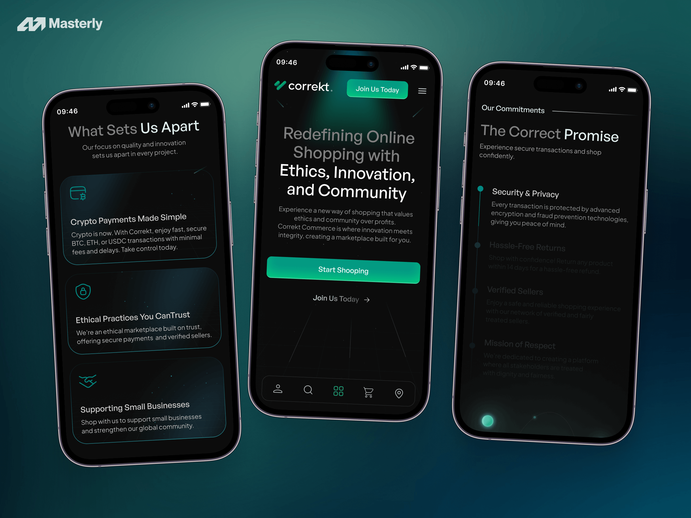 Instead of leading with products or features, we led with Correkt's mission: "Redefining Online Shopping — Ethics, Innovation, and Community." This emotional hook differentiates them from generic marketplaces.