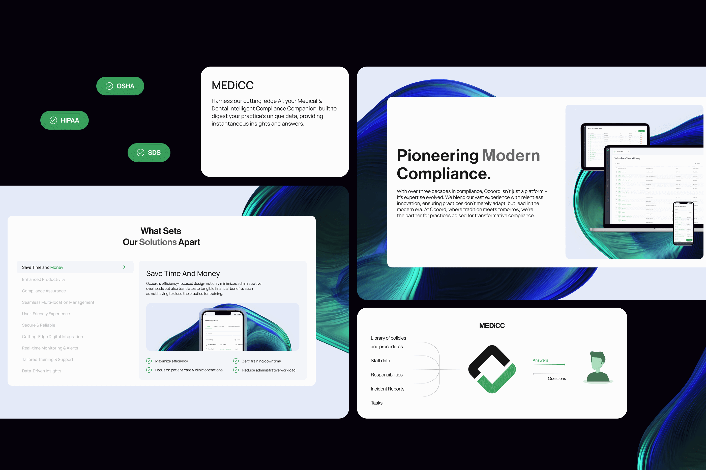 Clear presentation of core tools: MEDiCC (AI assistant), SDS library (900,000+ Safety Data Sheets), CheckMate (audit simulation), and searchable policy library — showcasing the heart of what makes Ocoord valuable.