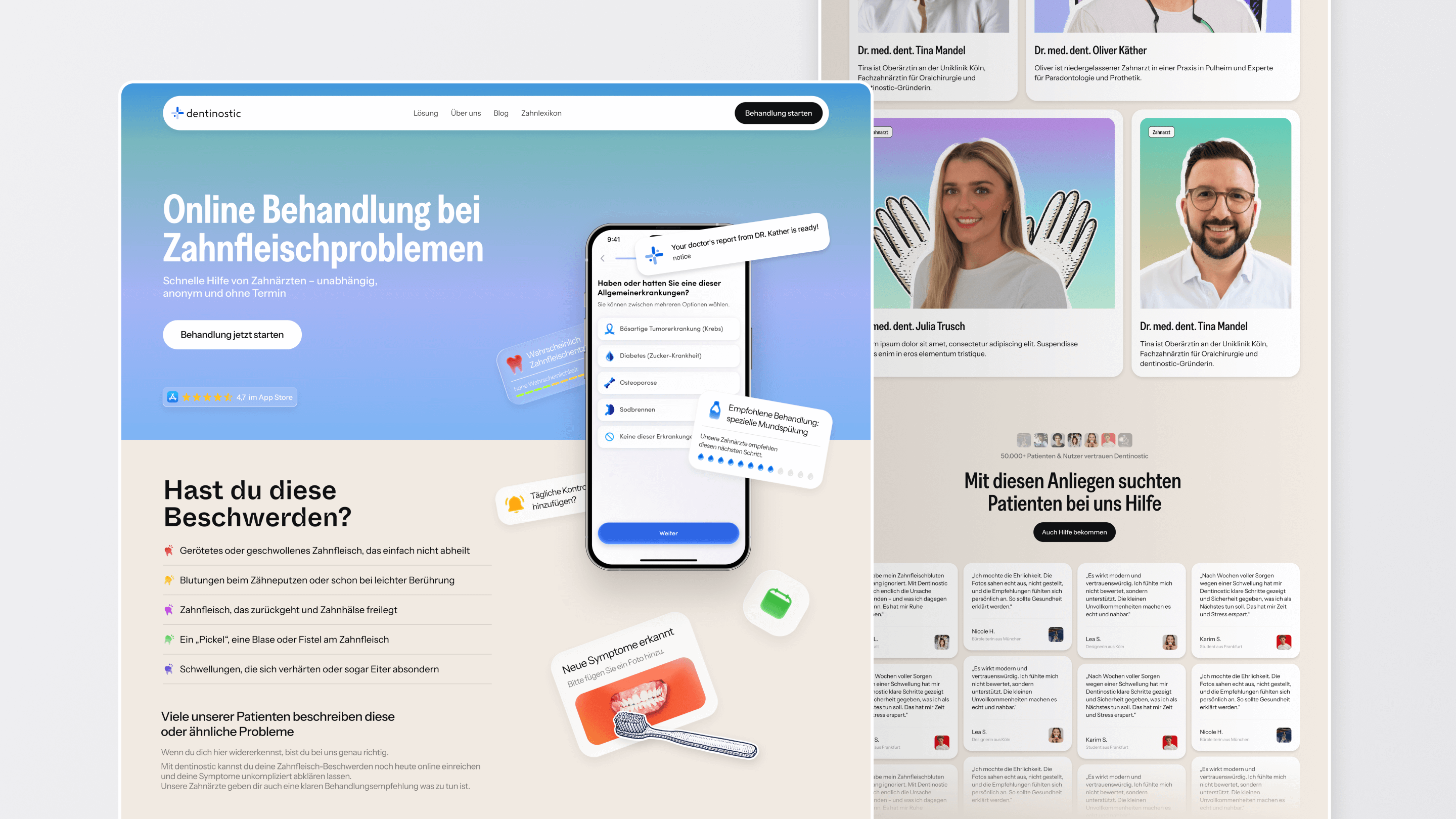 Patients trust doctors, not apps. We prominently featured the dental team — Dr. Tina Mandel (medical director), Dr. Oliver Käther, and other licensed professionals — with credentials and specialties visible. This builds immediate credibility.