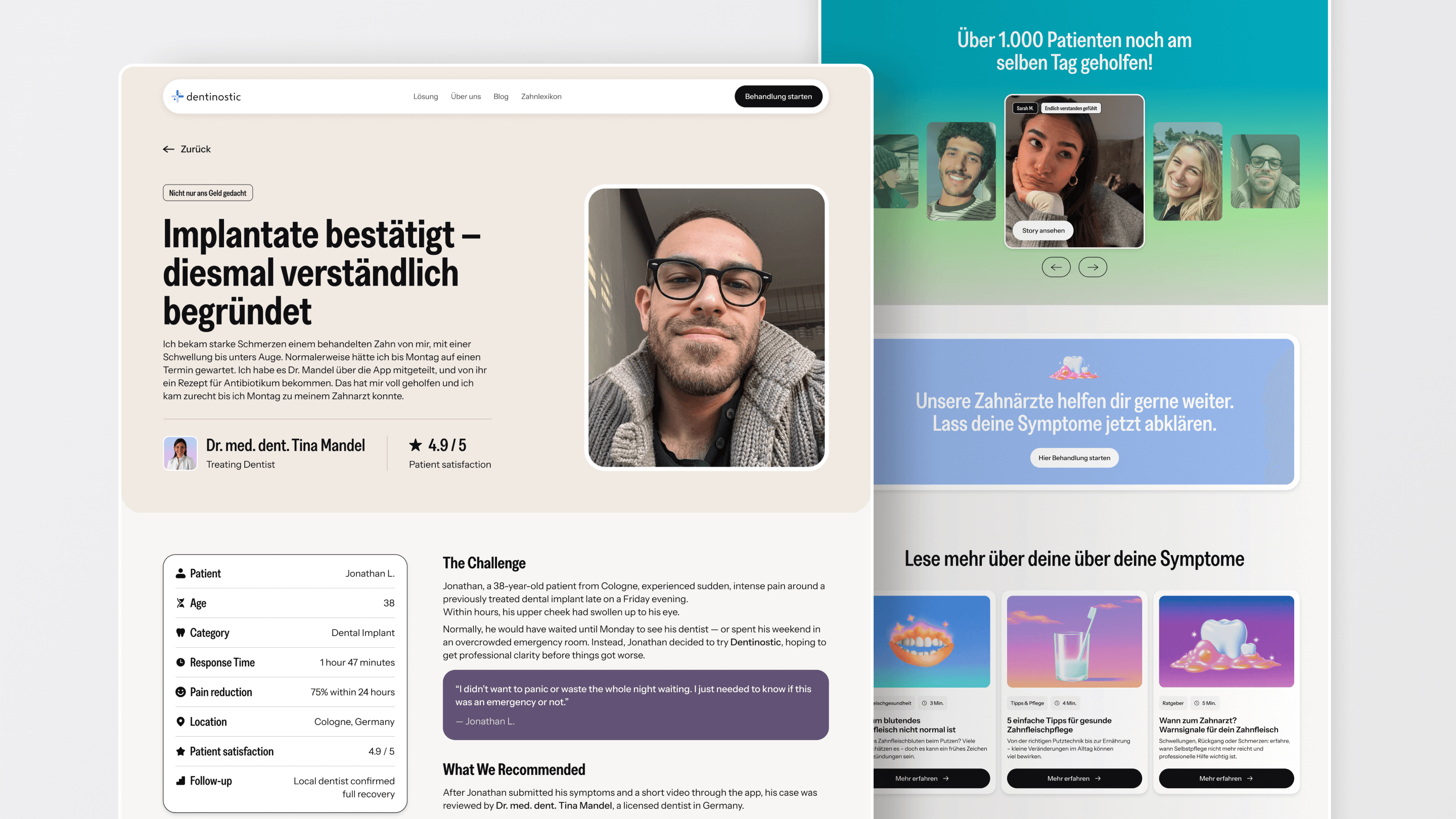 Instead of making patients self-diagnose, we designed symptom-based navigation: "Zahnschmerzen" (toothache), "Zahnfleischprobleme" (gum problems), "Weisheitszahnprobleme" (wisdom tooth issues). Users find their concern and start treatment immediately.